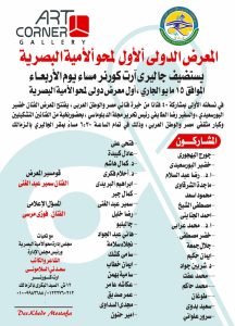 يستضيف جاليري “آرت كورنر” مساء غدًا الأربعاء المقبل، المعرض الدولي الأول لمحو الأمية البصرية في نسخته الأولى، ويفتتح المعرض الفنان خضير البورسعيدي، والسفير رضا الطايفي رئيس تحرير مجلة الدبلوماسي، بحضور رئيس مجلس إدارة مؤسسة محو الأمية البصرية الشاعر والكاتب سعدني السلاموني، ونخبة من الفنانين التشكيليين، وكبار مثقفي مصر والوطن العربي، وذلك في تمام الساعة 6:30 مساءً بمقر الجاليري بالزمالك.