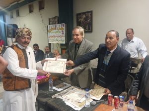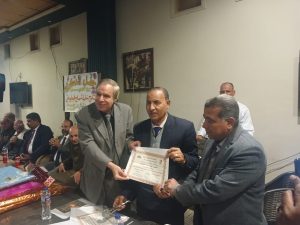 وفى الختام كانت كلمة الشبخ سامح ابومجيد الذى اعلن فى مفاجئة لأعضاء الشعبة ووفد النقابة ان اليوم هو عيد ميلاده وبداية مرحلة ربيع العمر فكان على الجميع ان يقدم له التهنئة داعيبن له بالعمر المديد وانهالت عليه التهانى والتكربمات فكانت شهادة التكربم الاولى له من النقابة العامة لانحاد كتاب مصر قدمها له الأستاذ زبنهم البدوى امين عام النقابة والكاتب ابو الفتوح البرعصى رئيس الشعبة وبهذه المناسبة تم تكريم كل من :– الصحفى الكبير التستاذ مصطفى خالد لدوره البارز فى دعم شعبة ادب البادية والتراث الشعبى .