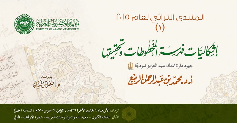 يستضيف المنتدى التراثي لمعهد المخطوطات العربية الدكتور محمد بن عبد الرحمن الرُّبيِّع (مستشار الدارة وعضو مجمع اللغة العربية بالقاهرة ) للحديث عن «إشكاليات فهرسة المخطوطات وتحقيقها : جهود دارة الملك عبد العزيز نموذجًا»، وذلك يوم الأربعاء الموافق 25 مارس الحالي
