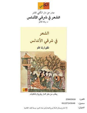مناقشة كتاب “الشعر في شرقيّ الأندلس للدكتورة رشا غانم ” اليوم الجمعة الساعة السابعة مساء في الصالون الثقافي للأستاذ الدكتور محمد حسن عبد الله  ويناقشه كل من الناقد الدكتور عايدى علي جمعة أستاذ مساعد بجامعة أكتوبر والأستاذ الدكتور بسيم عبد العظيم أستاذ الأدب العربي بجامعة المنوفية