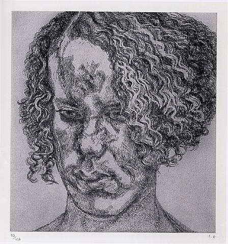 وبالعودة مرة أخرى إلى أعمال الفنان ” لوسيان فرويد Lucian Freud ” يتأكد لنا ذلك فأغلب أعماله قد ” أهتمت بإظهار الإيقاع الداخلى للشخصية، فنجد مثلاً لوحات طباعيه ركزت على الأشكال والوجوه الأيرلندية، حيث أظهر فيها بعض ملامح الصلابة إلى حد البلادة أحياناً والخواء فى أحيان أخرى، وهذا ما نلاحظه فى عمله “الفتاة ذات الشعر المجعد” شكل (6).