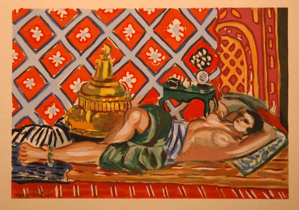 وفي عام (1922)م. وحتى نهاية ذلك العقد، أنتج الفنان ماتيس أشهر وأكثر مطبوعاته الحجرية انتشاراً، فالعديد منها ذات ارتباط وثيق بموضوعات المرأة واستخدامها بشكل استعاري في أعماله حيث استعار عنها بموضوعات العشيقات بصورة معبّرة جاذبة نقية. ويقول الناقد ك.باناس: “عالمه راقص تميّز بالشاعرية الرقيقة، و المغازلة اللطيفة، ولذَّة الحب بشكل دقيق، ومضبوط تماماً بتقنية الطباعة الحجرية التي اكتسبت النعومة والشاعرية لشخصوصه الأنثوية”([10]). وبعض هذه الأعمال بدت وكأنها استعارات محددة ودقيقة لموضوع ما.