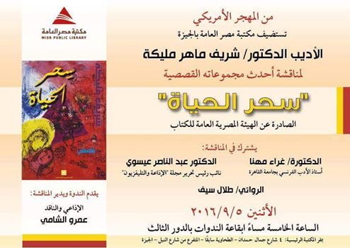 تستضيف مكتبة مصر العامة بالجيزة الآديب الدكتور شريف ماهر مليكة لمناقشة أحدث مجموعاته القصية ” سحر الحياة الصادر عن الهيئة المصرية العامة للكتاب ويشترك فى المناقشة الدكتورة غراء مهنا استاذ الادب الفرنسي بجامعة القاهرة والدكتور عبدالناصر عيسوي والروائي طلال سيف ويدير المناقشة الناقد والاعلامي عمرو الشامي