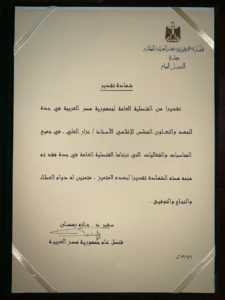 كرم سعادة السفير الدكتور حازم رمضان قنصل عام جمهورية مصر العربية بجدة الزميل الاعلامي نزار العلى مراسل قناة اقرأ الفضائية تقديرا من القنصلية العامة المصرية في جدة للجهد والتعاون المتميز الذي يبذله في التغطية الاعلامية للمناسبات والفعاليات التي ترعاها القنصلية العامة المصرية في جدة.