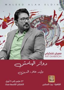 فى قاعة بيت السنارى بالسيدة زينب . وفى ليلة من ليالى قاهرة المعز الثقافية العامرة بالأجواء الرمضانية تم إفتتاح معرض الفن التشكيلى للكاتب والفنان المصرى المتميز وليد علاء الدين ويحتوى المعرض على إبداعات وتجارب تشكيلية تحت عنوان ( دوائر الهامش ) وهو المعرض التشكيلى الخاص الأول للكاتب الصحفى المعروف بالوسط الأدبى المصرى والعربى وليد علاء الدين الذى خاض هذه التجربة المكتملة بتقديم نماذج مختارة من تجاربه ورسومه خلال عدة سنوات ولم يقوم بعرض تلك اللوحات إلا بعد شعوره بإكتمال تلك التجربة من خلال إمتلاكه لأدواته وتمكنه من فرشاته والوانه ومعالجة أسطح لوحاته وكيفية توزيع المساحات اللونية ومن هنا أختمرت الفكرة بداخله لتحقيق العلاقة التكاملية بين الشكل والمضمون وذلك من خلال بحث وتفكير عميق حتى وصل لرمزية الدائرة وجعل من دوائر الهامش فى عالمه الخاص أن تجد مساحة للتحرك بين الخيال والواقع ومن هنا كانت أهمية الداوائر فى حياته والتى يراها من منظوره الأدبى إنها محطات يسافر من خلالها ذهابا وأيابا بين المركز والمحيط حتى رست سفينته على بر الآمان ليستقر ويستريح فى الواقع ثم يعاود رحلاته مسافرا هنا وهناك بين المركز والهامش ليحقق مايدور فى خلجته ويطرح تلك الأفكار بكل أريحية على سطح اللوحة ويمنح المشاهد فرصة للتفكير والسفر أيضا بين تلك البراحات التى شكلها من خلال الدائرة والنقطة والخط والحرف واللون والتداخل والتشابه والتقاطع والتشابك حتى أجبر المشاهد لتلك اللوحات ان يفكر جيدا فى ماذا يقصد الفنان ومن هنا كانت اللقيا بينه وبين الحضور وكانت الأسئلة والحوار الجمالى بين المبدع والمتلقى حول فلسفة تلك الأعمال التشكيلية التى أراها مكتملة الفكرة والنضوج وفيها كل القيم الجمالية للوحة التشكيلية المعاصرة والتى تجمع بين فلسفة عدة مدارس الواقعية والتجريدية والسريالية بل فيها سمات الحداثة والمستقبلية ونظرا لكون الفنان يجمع بين الإبداع الأدبى والتشكيلى ولديه ملكاته التى يطوعها ويروضها مسافرا منسجما بين تلك البراحات والمساحات لكونه مبدع حقيقى مؤمنا بوحدة الفنون وتكاملها بالشمول وهذا لم يأتى من فراغ بل تحقق ذلك لكونه قاص وروائى متحقق بدرجة مبدع ويمتلك أدوات المعرفة فى تلك المساحات ومن هنا نجح فى مد جسور للتلاقى بين لوحاته والمتلقى الذى يقف وقتا طويلا متأملا وبداخله العديد من الأسئلة وبعد تفكير عميق يترجم كل متلقى مفهومه من خلال خبراته المتراكمه ومعرفته وسرده وكيفية قراء اللوحة التشكيلية المرسومة على أسطح ومساحات مختلفة مع مراعاة وجود اللون ومدى صراحته وخلطه ووضوحه وشفافيته وفلسفته ودقة التفاصيل فى بعض الأعمال وبساطتها فى لوحات أخرى كل ذلك جعل من الفنان وليد علاء الدين فنانا حقيقيا يجمع بين فلسفة الكلمة والشكل بين السرد والبناء فى الرواية وبين حضور اللون والتشكيل الفنى على سطح اللوحة وفى المعرض الاول له فى هذا المكان الذى يجمع بين عبق الماضى وجمال الحاضر من خلال تجربة تشكيلية فيها كل سمات الأبداع وتناول فيها الوجوه التى عالجها تشكيليا باسلوبه الخاص وكذلك بالتة ألوانه والجمع بين الابيض والاحمر فى آن واحد والعلاقات اللونية المنسجمة التى تحقق الهارمونية المطلوبة لترتاح عين المشاهد لتلك اللوحات كما ترتاح لشخصية الفنان المبدع وليد علاء الدين الذى حقق من خلال فكرته دوائر الهامش دوائر أكثر أهمية فى عقل و متن و مركز كل مشاهد من خلال رسالته الثقافية أنه لافرق بين المركز والهامش بل هى علاقة تكاملية للبناء الثقافى والإجتماعى وكل مناحى الحياة . والفنان وليد علاء الدين هو كاتب ورسام مصرى حاصل على ماجستير الصحافة من كلية الأعلام جامعة القاهرة شغل عدة مناصب بالصحافة الثقافية العربية ويعمل حاليا مستشار لمركز أبوظبى للغة العربية . من مؤلفاته فى الرواية :- أبن القبطية – كيميا – الغميضة وفى مجال المسرح :- 72 ساعة عفو – البحث عن العصفور – – مولانا المقدم – وشى فى وشك . وفى مجال الشعر :- تر